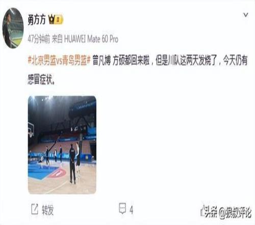 根據媒體人勇方方報道,曾凡博、方碩都回來參加了踩場訓練,但是翟曉川這兩天發燒了,今天仍有感冒癥狀。