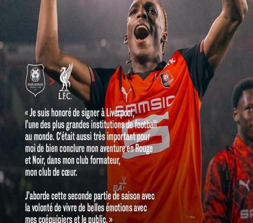 雅凱:我非常榮幸加盟利物浦,下半賽季將全力助雷恩圓滿收官
