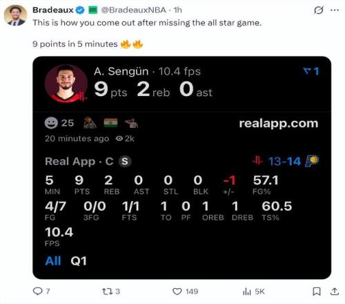 杜蘭特因傷缺席,申京再度回到上賽季的那種戰術地位,開場短短5分鐘就拿到9分(火箭全隊13分),首節申京9中5已經拿到11分2籃板1助攻。